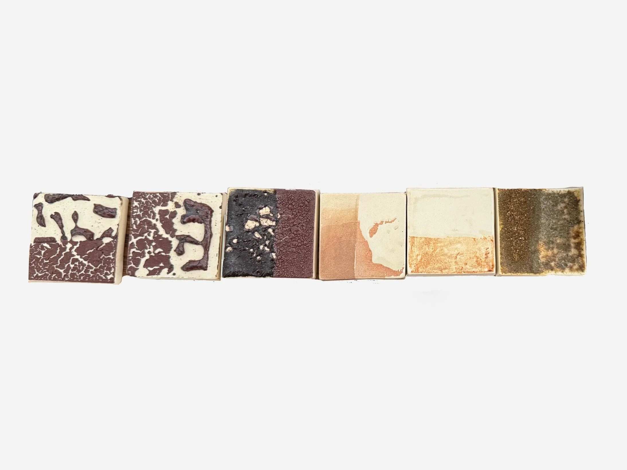 Each tile was coated with raw material, and on one half topped was with three layers clear zinc free glaze.